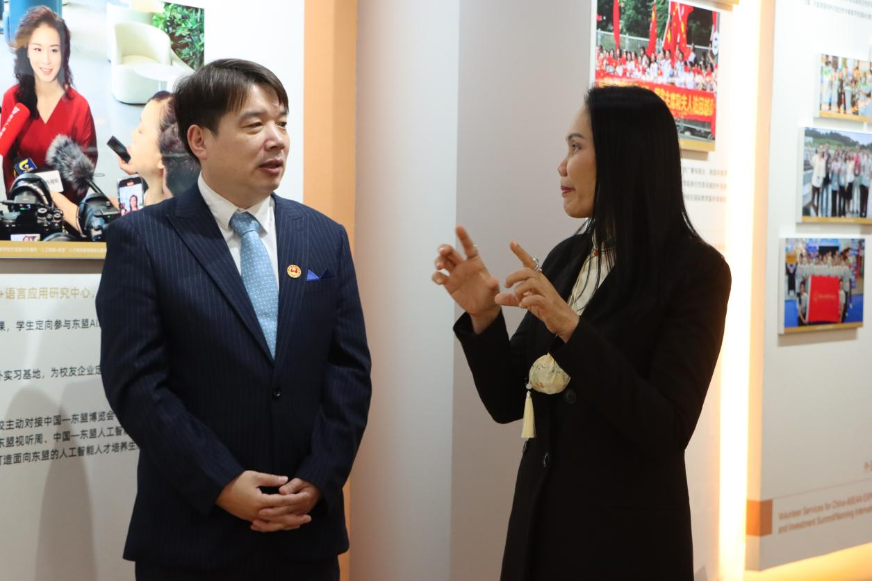 广西外国语学院国际交流处处长张云志热情接待,代表团先后参观了校史馆、国际化展馆、人工智能学院,体验了人机交互操作,还察看了学生宿舍、体验民族体育项目,对学校的办学与实践教学成果予以高度评价。