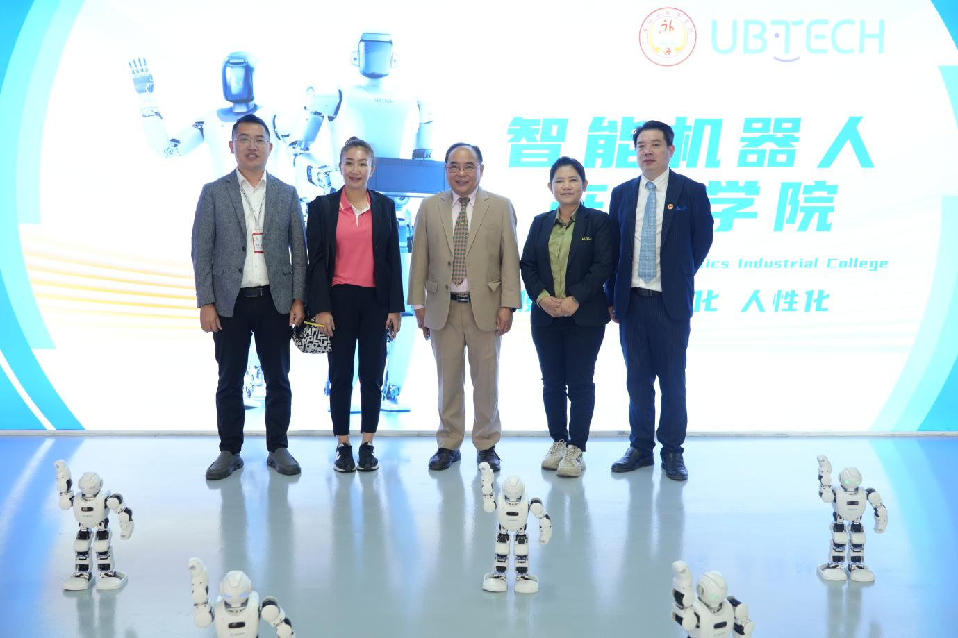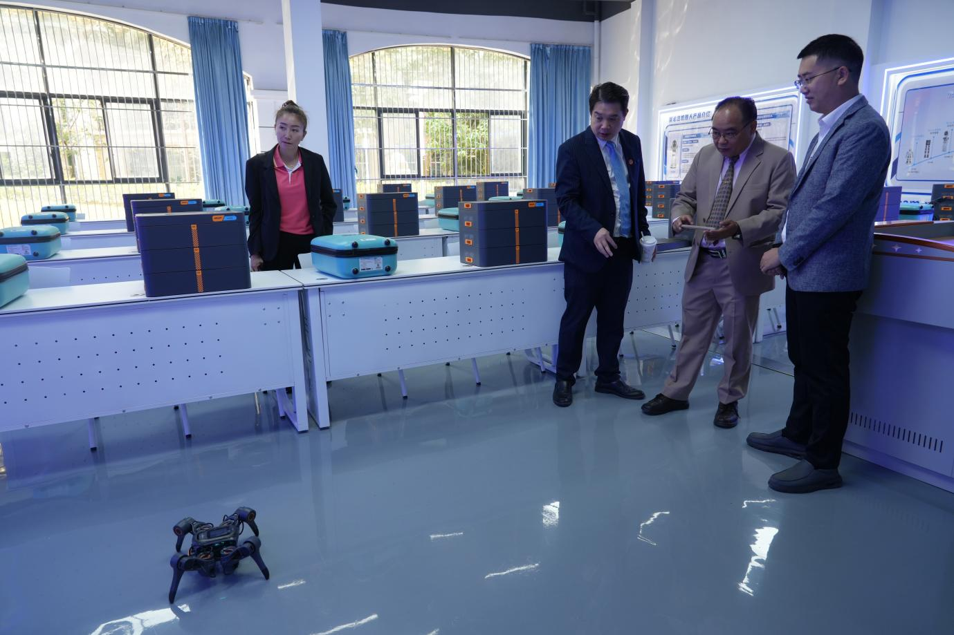 当日上午,威拉潘校长一行首先参观了我校国际化展馆,共同回顾了两校多年来的合作历程。随后,代表团走访人工智能学院,观摩机器人研发实验室,体验人机交互操作,并实地察看了我校新建的宿舍楼及生活配套设施。